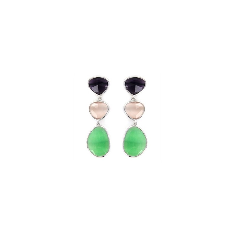 Pendiente Queen tres piedras facetadas irregulares morado rosa y verde presión