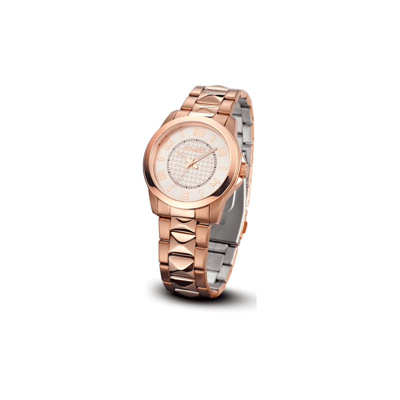 En este modelo de Duward Basic Lady, destaca el eslabn central de su brazalete en forma de pirmide. Caja y brazalete de acero con acabado IP rosado mate/brillo. Esfera blanca en cuyo centro aparece repetida nuestra W
