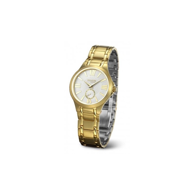 La colección Barcelona se caracteriza por la combinación de las líneas rectas de su brazalete con las curvas de su caja y esfera con segundero a las 6, que dan como resultado un diseño sencillo pero elegante.El acabado del acero en IP dorado le da un aire mas formal.