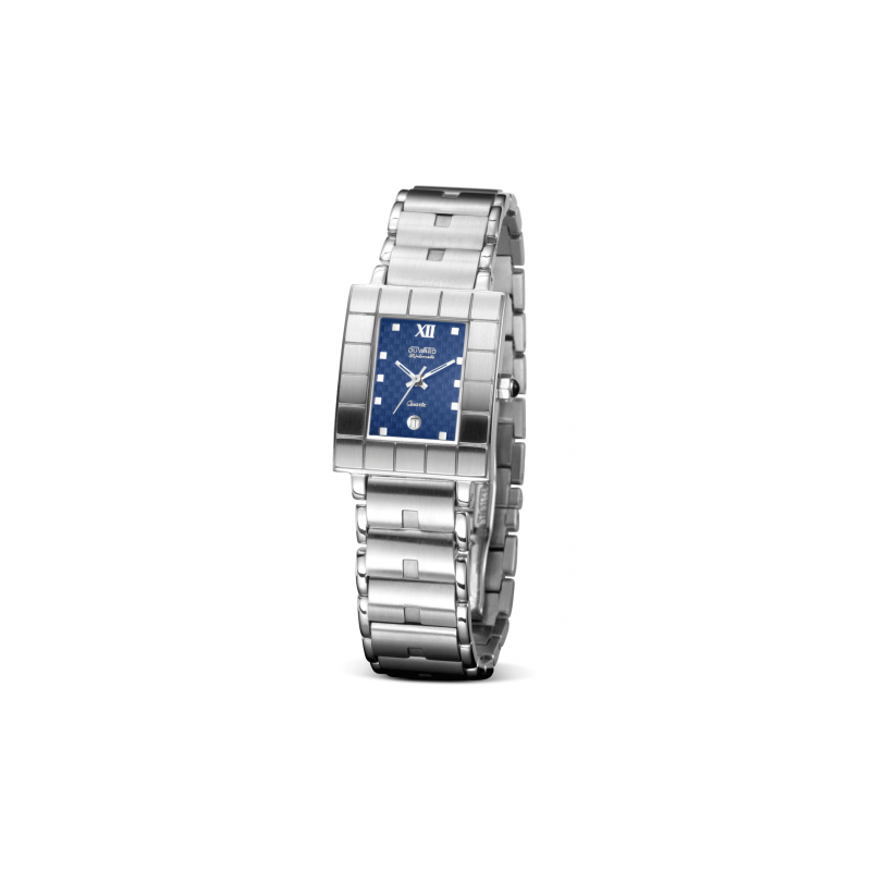 Caja y brazalete de acero en acabado mate/brillo. Maquinaria Suiza ESA 902.005. Esfera azul. Cierre oculto