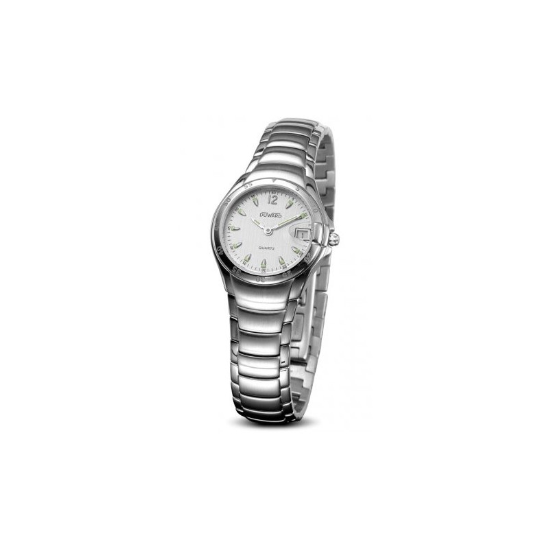 Duward señora, caja y brazalete de acero con acabado mate brillo. Maquinaria suiza . Cristal zafiro con lupa en forma de triangulo. y esfera blanca